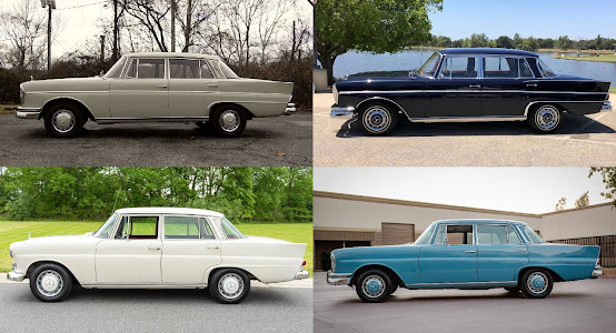 Mercedes-Benz Heckflosse: Top row W112s: 1964 300 SE (left) and 300 SE Lang (long) (right); Bottom row W111s: 1967 230 (left) and 1967 230 S (right). Although both 230s used the 2.3 litre straight-six, the basic 230 used the “short nose” front from the four-cylinder W110 while the more expensive 230 S was fitted with the “long nose” from the W111 & W112.