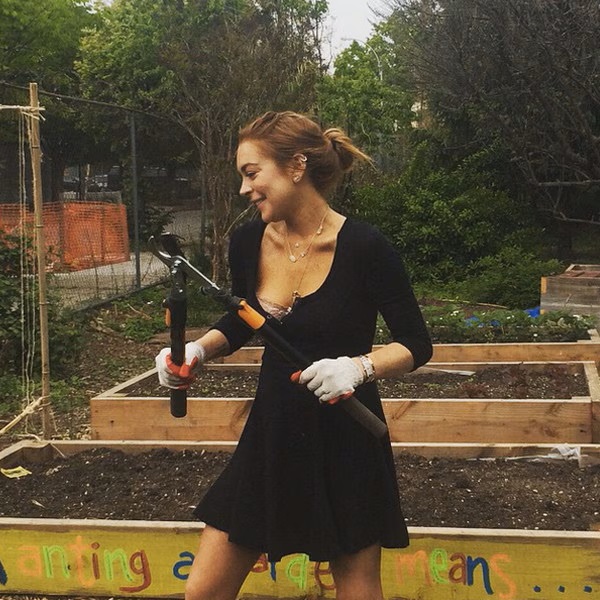 Lindsay Lohan gardening with a lopper in her gloved hands, decapitation a less demanding path to destruction than deracination, New York City, May, 2015.  She appears to be relishing the task.